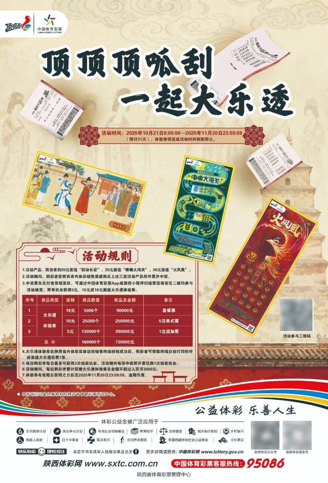 本次活动时间为2025年10月21日至11月20日,针对陕西省内20元面值“跃动长安”、20元面值“嘶嘶大闯关”和30元面值“火凤凰”三款即开型体育彩票展开。