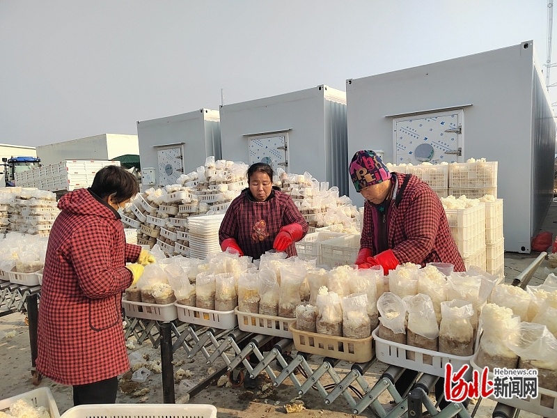 2025年12月30日,在新河县西流乡东董村汇珍食用菌有限公司,村民正在收割绣球菌。河北日报记者 马彦铭摄