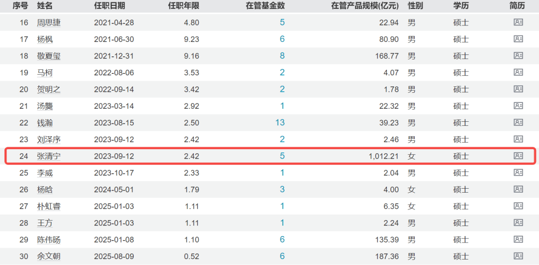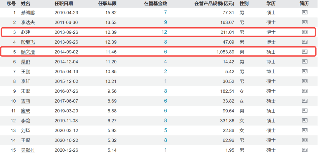 此外,两名基金经理的管理产品规模超过千亿,分别是颜文浩(管理规模1053.89亿元)和张清宁(管理规模1012.21亿元)。