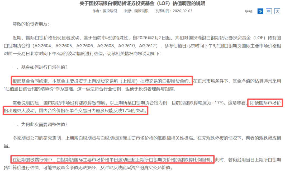 第一项公告发生在2月2日晚间,国投瑞银发布公告称,因国际银价暴跌,公司将旗下LOF基金的估值方法,从“上海期货交易所结算价”改为“参考国际银价波动”,因此导致该基金单日净值暴跌了31.5%。