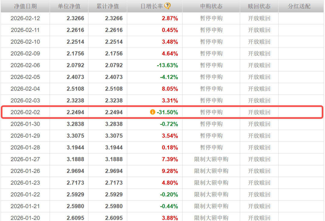 「子弹财经」翻阅了国投白银LOF A类产品详细信息,从其历史净值变化来看,2月2日,该产品的单位净值从上一交易日的3.2838元跌至2.2494元,单日跌幅高达31.5%。