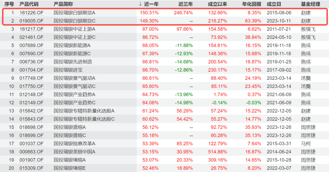 从产品收益率来看,国投瑞银有2款基金的近一年收益率超过100%,恰巧正是近期被热议的白银期货产品。