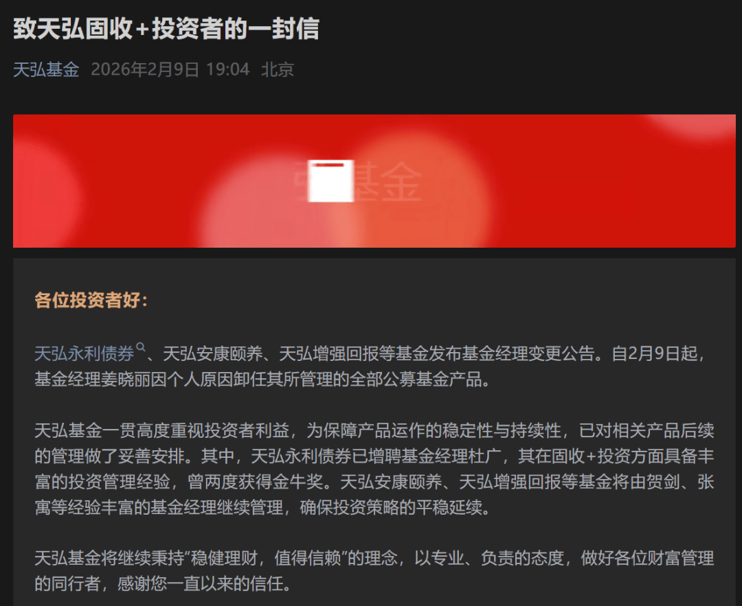 2026-02-15彩票,彩票平台,彩票网站,彩票APP下载,六合彩,快三春节前夕的公募圈,被一则离职公告打破平静。2月9日,天弘基金一纸公告,公司总经理助理兼混合资产部总经理姜晓丽官宣离任,清仓式卸任旗下全部10只公募产品,结束了自己近15年的天弘生涯,也让背后天弘基金的发展困境再度沦为谈资。