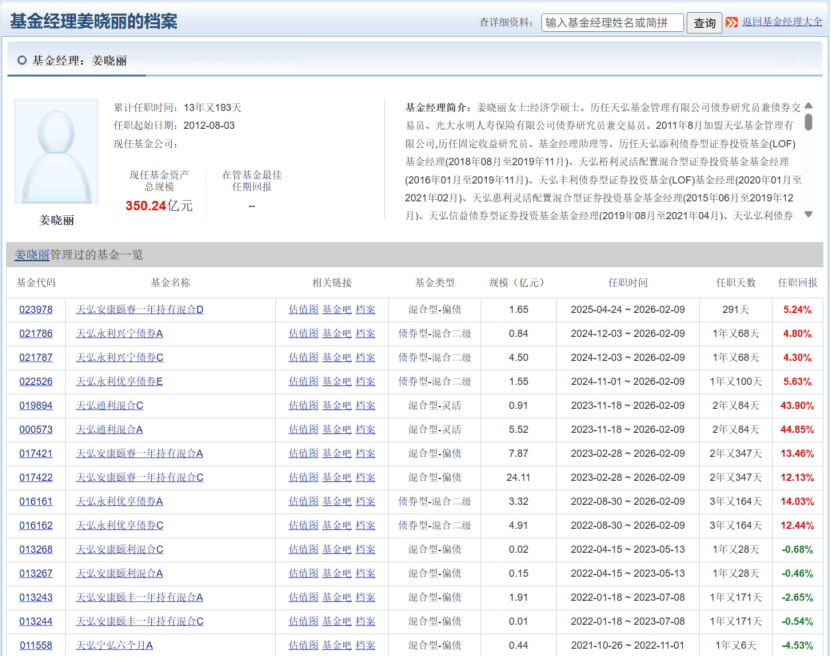 具体来看,对于熟悉固收领域的人而言,姜晓丽的名字并不陌生,其并非空降至天弘基金的明星基金经理,而是天弘基金一手培养起来的“顶梁柱”,更是业内为数不多能以一己之力撑起一家巨头固收+业务的核心人物。