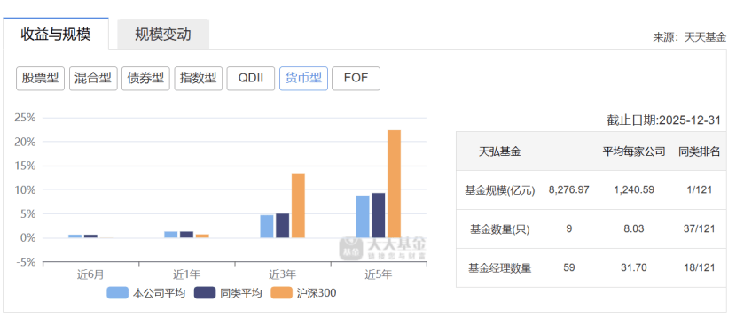 其二,业务结构失衡问题仍未解决。天弘基金长期以来“重货基、轻权益”的格局并未根本改变,截至2025年末,货币基金规模仍达8276.97亿元,占公募总规模的六成以上,而非货业务中,又高度依赖固收类产品,主动权益业务缺乏头部标杆产品,成为明显短板。与监管层推动公募基金高质量发展、强化权益投资的导向存在差距,非货规模排名也存在小幅波动。从影响上来看,这种过度依赖货币基金的业务结构,不仅盈利能力有限,还面临着监管政策调整、市场利率波动等多重风险,一旦货币基金规模出现下滑,将直接影响公司的整体业绩与行业地位。