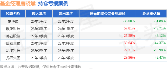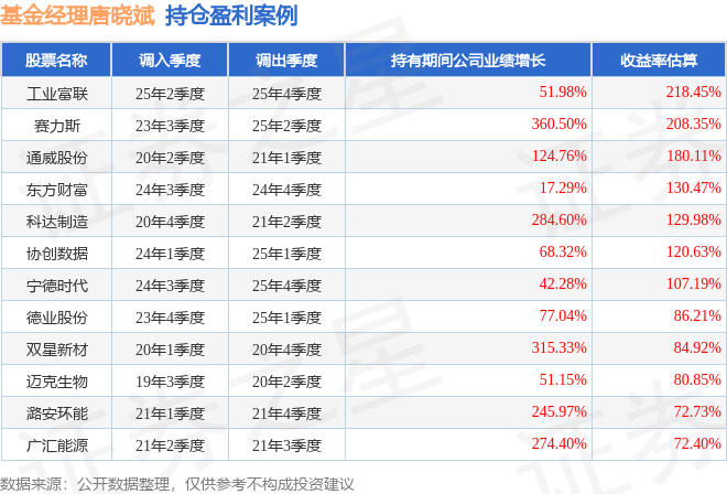 重仓股调仓示例详解: 1、工业富联(601138)翻倍案例: 唐晓斌管理的广发瑞誉一年持有期混合A基金在25年2季度买入工业富联,在持有2个季度后在25年4季度卖出。持有期间的估算收益率为218.45%,持有期间工业富联在2024年到2025年的年报归属净利润增幅达51.98%。 2、德业股份(605117)调仓案例: 唐晓斌管理的广发瑞锦一年定期开放混合基金在23年4季度买入德业股份,在持有1年又1个季度后在25年1季度卖出。持有期间的估算收益率为86.21%,持有期间德业股份在2023年到2025年的年报归属净利润增幅达77.04%。 3、易华录(300212)折戟案例: 唐晓斌管理的广发多元新兴股票基金在20年1季度买入易华录,在持有2年又1个季度后在22年2季度卖出。持有期间的估算收益率为-51.88%,持有期间易华录在2020年到2022年的年报营业总收入降幅为38%。